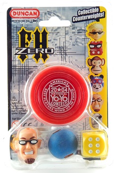Molded after the body of the original FreeHand, the Zero is a wide, butterfly-shape yo-yo; allowing for forgiving play and better stability. The ball bearing axle has been refined for maximum spin time while the weight has been re-distributed for optimum play. Each FH Zero came with three different counterweights. The included three counterweights in my version is a standard-sized yellow die, a blue rubber ball, and a sculpted character head of Steve Brown.