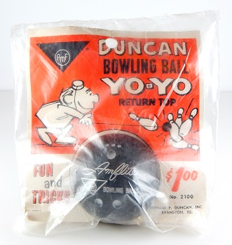 This second version from late 1964 has AMF Duncan Bowling Ball Yo-Yo Return Top printed on the saddle card. One halve is molded with "Duncan" and "Bo-Yo", however the lettering is painted white. The opposite side has a horizontal row of three small dots, "Amflite", the AMF (American Machine and Foundry) logo, and the words "Bowling Balls" molded into the halve and painted white. Three "finger holes" are also molded into the halve and also painted white. Some were made without the painted finger holes. Unlike the first version of this bowling ball that came out in early 1964, this version did not include a separate yo-yo trick sheet and bowling tips sheet. A stock number of 2100 was printed on the card.