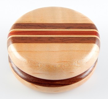 A nameless, fixed axle, handmade wooden yo-yo by Yoland Treasures. The yo-yo was hand sanded, then up to five applications of clear coat were applied to bring out the beautiful grains of each hardwood used in the yo-yo. It plays quite well!