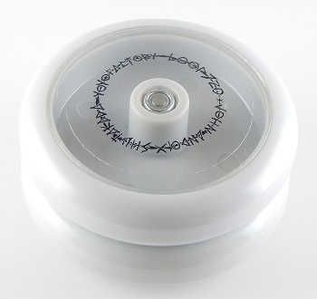 YoYoFactory has released a wide variety of Loop 720 colors and side caps designs over the years. Essentially, each release is the same yo-yo, but with different "lipstick". The version in this exhibit sports white (more like light grey) body halves, clear side caps, with a clear sticker with black text imprint. The yo-yo used dark blue (they almost look purple) spacers that gave the yo-yo a slightly wider sting gap that let you do string tricks easier. Red spacers were also available if you wanted a yo-yo with a narrow string gap for doing looping exclusively. You could also use green spacers if you wanted "middle ground" performance for doing both looping and string tricks.