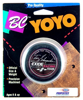 This modified-shaped yo-yo–in a similar vain to the BC Hip Pocket Yo-Yo–was part of BC/What's Next's Extreme Motorsports Collectors Series. Introduced in 2000, What's Next, under its BC brand, introduced a line of skill toys that had the look and feel of NHRA, including specific products for individual championship drivers. Some of the skill toy products in this series were packaged in National Hot Rod Association-approved lifestyle graphics. This series of BC yo-yos was not popular among yo-yo players and is quite hard to find now. They were released at the end of the yo-yo boom, when dead, unresponsive yo-yos were replacing fixed axle yo-yos in popularity. These yo-yos may have also been sold exclusively at drag races, too. I don't recall them ever being sold in stores.