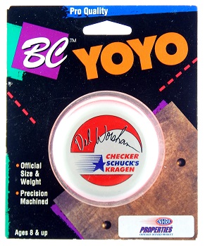 This modified-shaped yo-yo–in a similar vain to the BC Hip Pocket Yo-Yo–was part of BC/What's Next's Extreme Motorsports Collectors Series. Introduced in 2000, What's Next, under its BC brand, introduced a line of skill toys that had the look and feel of NHRA, including specific products for individual championship drivers. Some of the skill toy products in this series were packaged in National Hot Rod Association-approved lifestyle graphics. This series of BC yo-yos was not popular among yo-yo players and is quite hard to find now. They were released at the end of the yo-yo boom, when dead, unresponsive yo-yos were replacing fixed axle yo-yos in popularity. These yo-yos may have also been sold exclusively at drag races, too. I don't recall them ever being sold in stores.