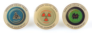 An obscure trio of Dracco Yo-Yo Team pinbacks from 2001 to 2003. Each pin is 26mm diameter. Despite the pins using "Dracco Yo-Yo Team" and "Yo-Yo Champion" in the design, the pins were never actually given exclusively to official Dracco Yo-Yo Team members (in fact, I have found no evidence that Dracco even sponsored a professional yo-yo team). Nor were the pins given to a player for winning a yo-yo contest. If you simply used a Dracco yo-yo in a contest or not, you were considered a member of Team Dracco worldwide. The "Yo-Yo Champion" title was akin to a popular feel good yo-yo slogan spoken by some yo-yo professionals: "Everyone's a winner" (even if you lose). These pins were made available through retail and also as give-aways by Dracco at yo-yo contests and other events, mainly throughout Western Europe/Denmark. The same art work on each pin was also used on actual Dracco yo-yos. Other round Dracco pinbacks also exist, not just the three seen in this exhibit.