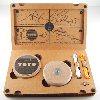 This release appears more of an exercise in packaging design than in yo-yo design. A very "green" box. Assembled in Michigan. Made of solid hard rock maple. They are calling the shape of the yo-yo "classic geometric". Has a fixed string gap, removable grooved steel axle shaft, and "environmentally friendly Velcro-Lock cardboard case". The yo-yo is natural nude (no finish at all) but it has a black printed logo—"Tait YoYo"—on the sides. Because of the printing on the yo-yo's face, they call the color of the yo-yo itself "classic black". Other colors produced were Azure Blue and Fandango Pink.
