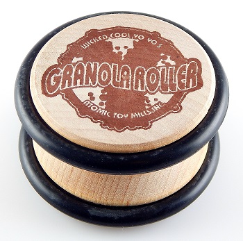 The Atomic Toy Mills, Inc. (90 Lakeview Avenue, Lowell, Massachusetts 01850) Granola Roller was a hand-assembled, two piece maple, butterfly yo-yo with rubber rings installed on the outer perimeter of each halve. Rubber rings were an addition often seen on various other yo-yo models from the late 1990s into the early twenty aughts. The rings on this model were marketed as a way to bounce the yo-yo off the ground. More often, however, yo-yo makers added them as rim protectors.