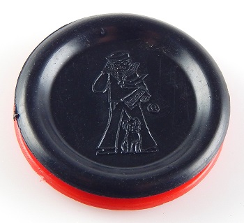 The black halve is molded with a silouette image of Cracker Jack's mascot Sailor Jack and his dog Bingo at his feet. Sailor Jack was modeled after the founder’s grandson, and his image first appeared on Cracker Jack boxes in 1918.