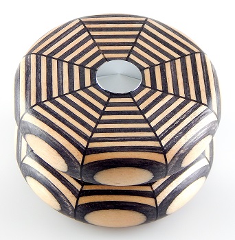 From www.etsy.com/shop/TheBoiseWoodworks "Made from maple with layers of black spectra-ply wood on each side to create a spider-web appearance. This ball bearing style yo-yo is shaped in the classic standard style. Silky smooth to the touch, the yo-yo has an all natural finish of mineral oil followed up by a buffing with carnuba wax. The yo-yo is approx. 2-1/4” in diameter and weighs 2.6 ounces.
