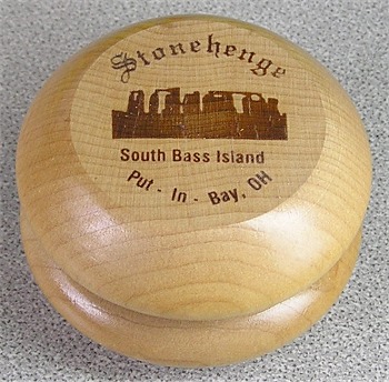 This Hummingbird advertising yo-yo is for some sort of business in Put-In-Bay, Ohio. Another example of a business using natural wood yo-yos as a promotional item.