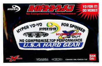 Made by the Apparel Division of Bandai Co. Ltd. in 1998, the seven-colored THP U.S.A. Hard Gear patch showcased one of more than 20 different Hyper Yo-Yo-themed iron-on patches that were sold at Bandai trick certification centers inside retail stores. It's possible that these patches were also used as prizes in yo-yo contests. Sometimes the patch highlighted a particular yo-yo model that was licensed by Bandai from either Yomega or Playmaxx of the U.S.A.