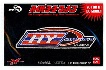 Made by the Apparel Division of Bandai Co. Ltd. in 1998, the four-colored 'HY' patch showcased one of more than 20 different Hyper Yo-Yo-themed iron-on patches that were sold at Bandai trick certification centers inside retail stores. It's possible that these patches were also used as prizes in yo-yo contests. Sometimes the patch highlighted a particular yo-yo model that was licensed by Bandai from either Yomega or Playmaxx of the U.S.A.
