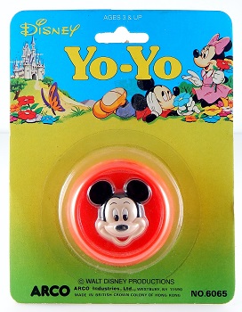 These licensed Disney Mickey and Donald yo-yos—with the raised relief of Mickey Mouse's head on one side and Donald Duck's head on the opposite side—are fairly common and easy to find in various conditions. Plastic body colors were either red or blue. No response and a fixed, metal axle. The yo-yo can be found in two different packaging variations. The packaging in this exhibit is the earliest version from about 1983, three years before Mattel acquired Arco in 1986. The lower portion of the card front is printed with the following: