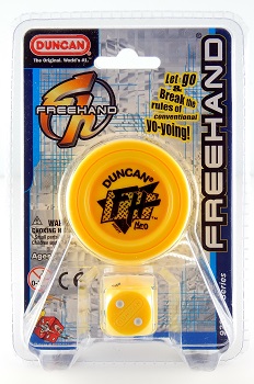 Plastic Duncan Freehand One 2022 - Neo yo-yo in neon yellow. A reprise of the original "Neo" color palette of neon blue, green, orange, pink, and yellow that Duncan first used on their Imperial model from 1994-2004. The only neon color that wasn't released on the Freehand One 2022 was Neo blue. Everything else is the same on this model as other Freehand One 2022 models.