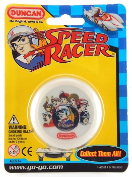 Essentially, a plastic, fixed wooden axle Duncan ProYo model with glow in the dark body. The side cap features the main characters from the popular Japanese anime series Speed Racer. Surrounding the main protagonist on the side cap -- Speed Racer -- are the following characters from left to right:
