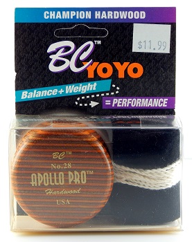 BC/What's Next Apollo Pro - No. 28 in natural/dark brown maple laminate. This yo-yo was the first release of the Apollo Pro by the newly formed company BC/What's Next in 1995. The trademarked logo design would change in 1996 but the number would stay the same. A very nice, full, clear logo imprint and no degradation of the clear coat. This early version is hard to come by.
