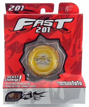The Gold Edition FAST 201 wasn’t just a colorway, it was a prize yo-yo. During YoYoFactory’s F.A.S.T. Challenge promotions, players who completed the ten listed tricks in 15 seconds or less earned a Gold Edition F.A.S.T. 201 (not a regular retail release; noted in the 2006 Singapore promotion). Same 201 guts from the regular edition (adjustable starburst response), but with special gold/yellow caps and gold edition print to mark the achievement.