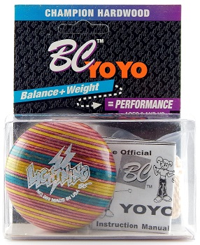 BC Yo-Yo became a bit careless when it came to the packaging and other models; note that the card insert was branded for a BC Rainbow model. This indifference is found on many of their packaged yo-yos from the late 90s into the early twenty aughts. The wrong card insert in the packaging does not (and should not) decrease the value of the yo-yo. Some packaging also came with a "Wood Rocks - Tom Kuhn - Yo-Yo Instruction Manual", some came with "The Official BC YoYo Instruction Manual", while some didn't come with any manual.