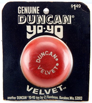The Duncan Velvet was basically a Duncan Imperial model covered with a nylon flocking to give it a fuzzy, velvet-like texture. The Velvet model came in a variety of flocked colors including red (seen in this exhibit), green, pink, yellow, orange-brown, purple, light blue, and black. Other colors may also exist.