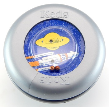 The plastic Keds Space Wheel from the early 1970s was a free premium given to customers who bought a pair of Keds-brand shoes. The two-piece yo-yo was packaged in a cellophane wrapper along with an instruction/astronaut talk card, one thick gauge cotton cord, a ball puzzle picture, and small disc for the whistle portion. Like the free premium Duncan Junior and ?Cracker Jack yo-yos, the axle of the Space Wheel was molded into one halve and press fit into the other halve. The cord had to be tied around the axle and the ball puzzle picture press-fit into one halve face. The opposite side featured a whistle and the Morse Code molded into the plastic. You could blow the whistle for fun, or to send a Morse Code signal to your friends. As a yo-yo, it was poor quality and basically useless. But, hey, it was free! (sort of).