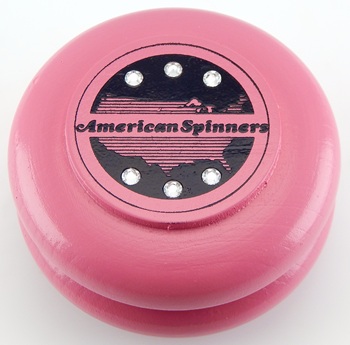 The American Spinner Rhinestone Spinner (RS-1000) was a customized American Spinner standard Shocking Pink (SP-105) model with 12 rhinestones added to it, six each side. A beautiful one piece wood yo-yo with slightly bulging sides. Came in its own American Spinners yo-yo garage. Yo-yos were not intended for children under 12 years.