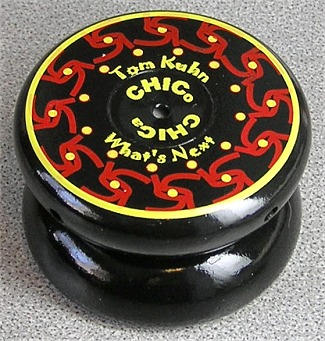 Pictured the first pre-release of the concave version, only sold at the National Yo-Yo Contest in 2004. The production release was delayed, because the whistle was not performing as Tom Kuhn had wished. The primary view is the reverse side, because notice the slightly different logo. "Chica Chico" is added to the logo, painted on the whistle itself. That text does not appear on the final release.