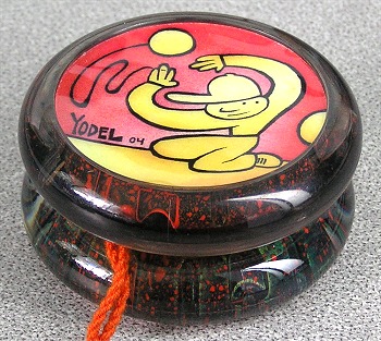 One of Mr.Yodel's custom designs from 2004. John Higby has been well know for his painting and custom yo-yos since the early days of Proyo. He paints the "inside" of clear yo-yos for a radiant effect on the outer surface, and usually adds one of his custom sidecaps as well. He turns standard clear releases into Yo-Yo Art. This is painted and "yodelized" Duncan Proyo with wooden axle and weight distribution. Released sometime in 2004.