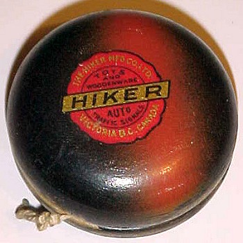The logo reads "The Hiker Mfg Yo-Yo, Toys and Woodenware, HIKER, Auto Traffic Signals, Victoria BC Canada." Hiker also made Traffic signals??!!