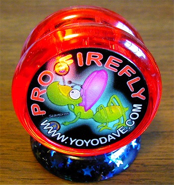 The Pro-Firefly was a custom design sold only at Dave's Skill Toys online store. The artwork was designed by Scarecrow, Matt Carter. Matt used artwork that was previously used as a web graphic at skilltoys.com and created this unusual sidecap design. This yo-yo carried the web address of yoyodave.com, because this was a hybrid product, not made completely by Playmaxx. The yo-yo is a Pro-fire GT and the sidecaps were made by Playmaxx as well. A bee bearing was installed rather than the standard brass transaxle. The light kits were made by Spintastics for their light up yo-yos, including the Firefly. Hence the name of the hybrid, Pro-fire + Firefly, for "Pro-Firefly". The lightup kits were each installed by the staff at skilltoys.com, creating an unusual and high performance lightup. Only about 30 of these were made.