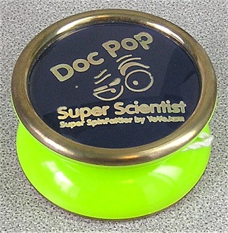 This is the first of the signature models made by YoYoJam for Doc Pop. It is a standard Super SpinFaktor with Brass colored weight rings, and in a bright neon Lime Green with Dark blue side caps.