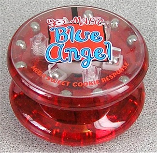 The Blue Angel is a concave version of the original Black Mamba. The new "cookie" response system is also used, a special system with a rubberry recessed pad with teeth. Noted as "Yo-Matic", that is the term Abbe used to explain its auto-return centrifugal cam system. The Blue Angel also has some additional rim weighting.