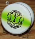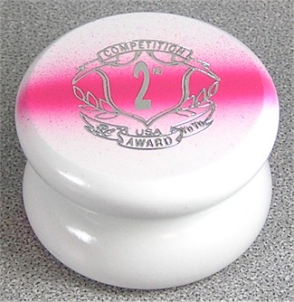 This yo-yo was given as the 2nd Place award in a BC yo-yo contest. A simple wooden Concave with a very bright paint job. Notice, that while the colors do not follow the gold, silver, bronze system of awards, the logos on these do. Notice the logo foil used on the second place award is Silver. The logo is impressed, and appears on both sides of the yo-yo.