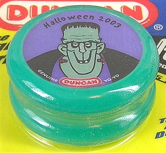 For Halloween 2003, Duncan released some special edition Proyos. Pictured here is the Frankenstein version, still shrink wrapped on a standard Proyo card. Like all collectibles, yo-yos are worth more to collectors if still sealed in the original packaging. So this yo-yo was never opened.