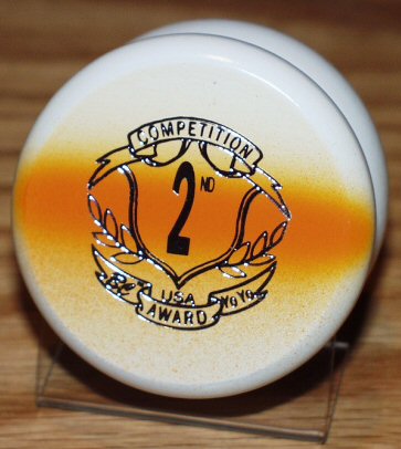 This yo-yo was given as the 2nd Place award in a BC yo-yo contest. A simple wooden Concave with a very bright paint job. Notice, that while the colors do not follow the gold, silver, bronze system of awards, the logos on these do. Notice the logo foil used on the second place award is Silver. The logo is impressed, and appears on both sides of the yo-yo.