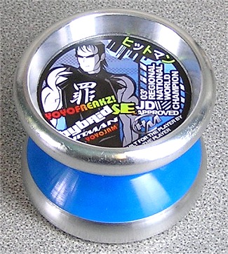 The Logo Side View shows two variations of the logo design. Although SE stands for special edition, this is just like other Hybrid Hitmans. Just a custom logo cap with "SE" and a link to an online store for advertising. The medium opaque blue pictured here was released in July of 2005, and has the "SE" logo, although these were sold to all vendors selling YoYoJam products.