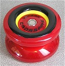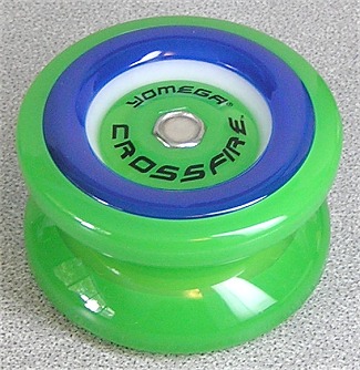 The Crossfire was Yomegas next step towards a more high perfomance yo-yo. The starburst response was replaced by a rubberized inner disk around the bearing, soft to the touch. Spacers were reversible, for gap adjustment. Also, a larger diameter bearing was used than in the previous Yomega releases.