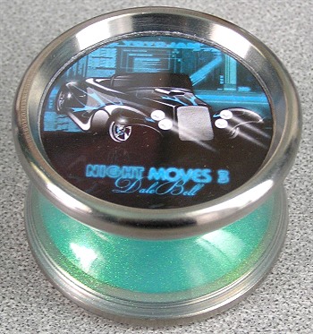 Dale Bell of YoYoJam updated his signature Night Moves yet again in 2004. While still keeping the double Yo-Ring response, the Night Moves was "slimmed" down, and titanium weight rings were added. The first production yo-yo to use titanium in the design. These were all made in a clear enyo plastic, hence the glitter effect. Different color side caps were used, and the caps were painted on the underside to create the interesting glowing effect. The halves themselves are not painted, just the underside of the sidecaps.