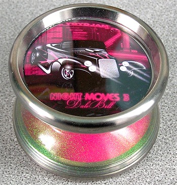 Dale Bell of YoYoJam updated his signature Night Moves yet again in 2004. While still keeping the double Yo-Ring response, the Night Moves was "slimmed" down, and titanium weight rings were added. The first production yo-yo to use titanium in the design. These were all made in a clear enyo plastic, hence the glitter effect. Different color side caps were used, and the caps were painted on the underside to create the interesting glowing effect. The halves themselves are not painted, just the underside of the sidecaps.