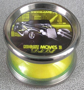 Dale Bell of YoYoJam updated his signature Night Moves yet again in 2004. While still keeping the double Yo-Ring response, the Night Moves was "slimmed" down, and titanium weight rings were added. The first production yo-yo to use titanium in the design. These were all made in a clear enyo plastic, hence the glitter effect. Different color side caps were used, and the caps were painted on the underside to create the interesting glowing effect. The halves themselves are not painted, just the underside of the sidecaps.