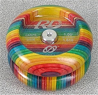 The RD-2 was the general release of this design, after the special release of the limited TK-60. Pictured here is an laminated wood version of the RD-2 in the popular Rainbow wood. Laminated woods not only made for interesting colors, but improves weight distribution in wood yo-yos.