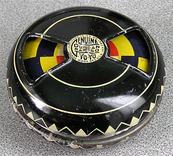 The Duncan Tin Rainbo is a very unique model. Nothing similar has been made since. The patent information on the logo says it began production in 1934, but the length of production is unknown. The Rainbo consists of a tin body, tin inner and outer shells, with a metal axle. And inside the windows on the side, a tin wheel with multicolored patterns and designs. Throw the yo-yo, which actually gives good sleep times, and return it to your hand. Catch the yo-yo, and the color wheel continues to spin inside each side of the yo-yo. Because of age, rust is common on these. Not to mention most are well worn, because most have been played with for several generations.