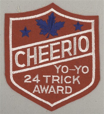 Another traditional shield patch in Red, White, and Blue, but this one is unique in several ways. Trick award patches were given if the contestant could successfully complete a certain number of tricks, 24 in this case. A large patch for a Trick Award. Also note the Cheerio maple leaf embroidered in blue at the top of the patch.