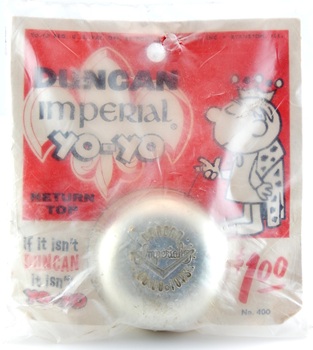 A Duncan Imperial No. 400 with a chevron hot-stamped on the face of one half. It sports shiny silver chromed plastic, although the aged and worn polybag obscures some of the finish. You can see the chrome by looking through the punched hole in the polybag. The material is similar to the chrome plastic used on vintage Monogram and Revell model kits from the same period. This version does not have TEN-ITE hot-stamped below the chevron. Duncan also offered it in a gold chrome version.